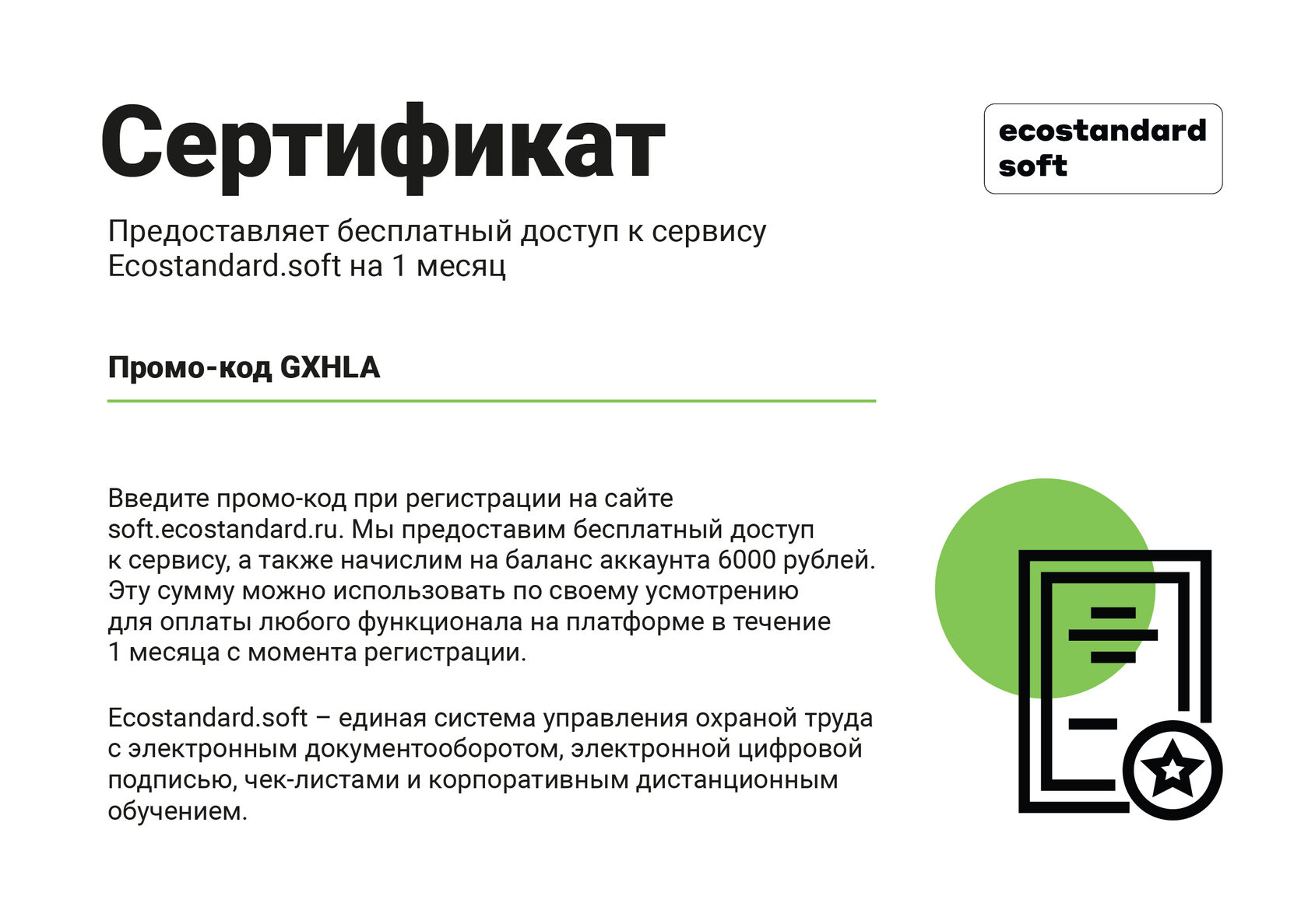 | Как активировать промокод: | | | 1. Пройдите регистрацию в Ecostandard.soft по ссылке. | | | | 2. Введите промокод при регистрации. | | | | 3. Вы получите 6000 рублей на личный счет для знакомства с возможностями сервиса и полноценной работы в течение месяца. | | | | ⚡ Ecostandard.soft автоматизирует систему управления охраной труда и обучение сотрудников. Электронный документооборот, ЭЦП, подпись документов онлайн, обучение сотрудников, чек-листы и многое другое в одном месте. С Ecostandard.soft ваша компания всегда готова к проверке, а у специалистов больше времени для реализации действительно важных задач. | | | | ⭐ Владельцам бизнеса, директорам компаний; | | | | ⭐ Руководителям, специалистам по охране труда; | | | | ⭐ HR-директорам и специалистам по кадрам; | | | | ⭐ Ответственным за корпоративное обучение. | | | | Почему клиенты выбирают Ecostandard.soft | | | | ✅ Занимаемся охраной труда 25 лет и отлично знаем все боли и проблемы на уровне специалиста и руководителя по ОТ, директора компании; | | | | ✅ Сервис разработан крупнейшим поставщиком услуг по СОУТ, ПК, охране труда и корпоративному обучению в России; | | | | ✅ Всегда оперативно обновляем продукт вслед за изменениями законодательства; | | | | ✅ Ваши данные в безопасности: все храним на российских серверах и не зависим от санкций и запретов иностранного софта, соблюдаем 152-ФЗ «О персональных данных»; | | | | ✅ Автоматизация рутинных задач, чтобы сместить фокус на «реальную» безопасность. В среднем 3 часа в день освобождается на работу с сотрудниками. Полный пакет документов на нового сотрудника оформляется в 3 клика менее чем за минуту; | | | | ✅ Вероятность ошибки в Ecostandard.soft равна нулю: сервис сам формирует документы, распознает и проверяет данные; | | | | ✅ Понятный алгоритм и удобный интерфейс позволяет эффективно работать с любого устройства; | | | | ✅ Быстрое внедрение и настройка сервиса без закупки дополнительного ПО и привлечения IT-специалистов; | | | | ✅ Обучаем работе в сервисе. Каждому доступна бесплатная персональная демонстрация функционала в формате онлайн-встречи на 30 минут. Высылаем видеоинструкции и доступ к базе знаний. | | | | Воспользуйтесь функционалом Ecostandard.soft или закажите доработку под индивидуальные нужды вашей компании.