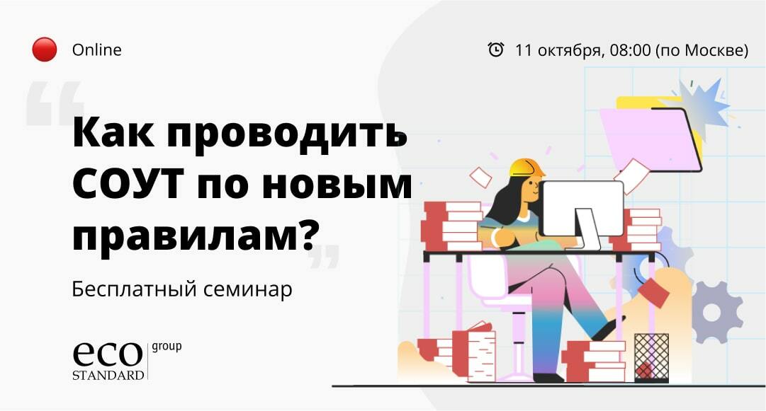 ⭐ Приглашаем принять участие в вебинаре «Изменения в проведении СОУТ с 1 сентября 2023 года». Всего за час эксперт EcoStandard group поможет вам разобраться в поправках к федеральному закону от 28.12.2013 №426-ФЗ «О специальной оценке условий труда».
