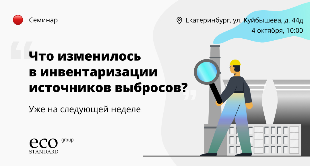 | ⭐ Приглашаем принять участие в семинаре «Особенности проведения инвентаризации источников выбросов для объектов I–III категорий». Эксперты EcoStandard group и представители государственных органов разберут изменения законодательства в области охраны атмосферного воздуха и ответят на все интересующие вас вопросы.